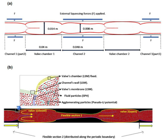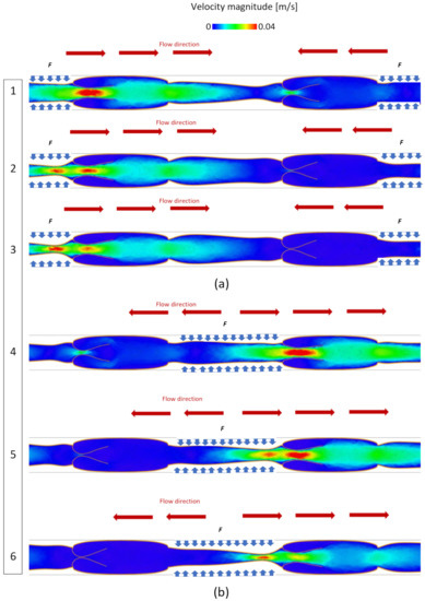 The blood flow moves from left to right (Figure 3) under the pressure generated by applying the force F to the flexible sections. As mentioned, F simulates the effect of muscles in the leg contracting around the vein. The higher pressure generated by F opens the valve on the left and simultaneously closes the valve on the right of the contracted section, as is illustrated in Figure 3a, where periodic boundary conditions are applied to the system. Subsequently, the contracted section is released, and F is applied to the other section, causing the open valve to close and the closed valve to open. This prevents backflow and produces a unidirectional flow in Figure 3b from left to right.