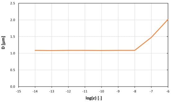 Average size of the agglomerates associated with different pair potential values between ε = 10−⁸ J and ε = 10−⁶ J at specific times (t = 12.5 s). Above the value of ε = 10−⁸ J, agglomeration starts, and the size of the agglomerates increases linearly with log(ε).