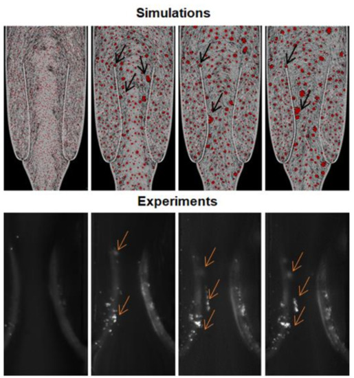 Simulation and experiment (platelets, fluorescently labelled, agglomeration in Schofield et al., 2020) snapshots illustrating the aggregates near the valve’s leaflet at different time points. The arrows indicate the aggregates near the valve leaflets.
