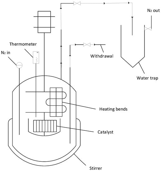 One of the two reactants was loaded firstly in the reactor and was heated up to the desired temperature; when it was reached, the other reactant and the catalyst were loaded. This is considered the beginning of the reaction. The scheme of this reactor is reported in Figure 1.