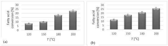 As can be seen in Figure 3, the maximum reached conversion degree is 18% at 180°C for the system oleic acid/1,3-propanediol (run1), while it is 21% at 180 °C (run 7) for the system oleic acid/glycerol. At 200 °C for the system with 1,3-propanediol (run 2), it is possible to observe a conversion value of 23%; for the system with glycerol (run 8), the conversion value is 26%. From these results, it is possible to note that there is a significant blank contribution. Moreover, conversions obtained with glycerol are always slightly higher than the ones reached with 1,3-propanediol, showing a higher activity of the triol compared to the diol.