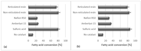 In their study, Maquirriain et al. [15] showed that in the glycerol esterification, homogeneous catalysts (e.g., sulfuric acid, p-toluenesulfonic acid, and methanesulfonic acid) were preferred to the heterogeneous ones thanks to their higher activity. In our work, it was seen that for the system oleic acid-glycerol (Figure 4b) the highest conversion values are achieved using sulfonic resins and these values are comparable to those obtained using sulfuric acid. At 120 °C, the blank contribution to the conversion, in this case, is also low (13%), but the values obtained with the use of sulfonic resins and sulfuric acid is high; using sulfuric acid, 86% was reached, with non-reticulated resin, 83%, and with reticulated resins, 78%, respectively.