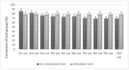 Both reticulated and not-reticulated resins can resist high temperatures up to 200 °C but they have different acidity: the non-reticulated resin has an acidity equal to 5.4 meqH+/g, while the acidity of the reticulated resin is equal to 4.3 meqH+/g [42].