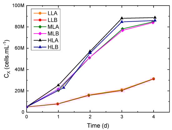 - Gris, B.; Morosinotto, T.; Giacometti, G.M.; Bertucco, A.; Sforza, E. Cultivation of Scenedesmus obliquus in Photobioreactors: Effects of Light Intensities and Light–Dark Cycles on Growth, Productivity, and Biochemical Composition. Appl. Biochem. Biotechnol. 2014, 172, 2377–2389. [Google Scholar] [CrossRef]