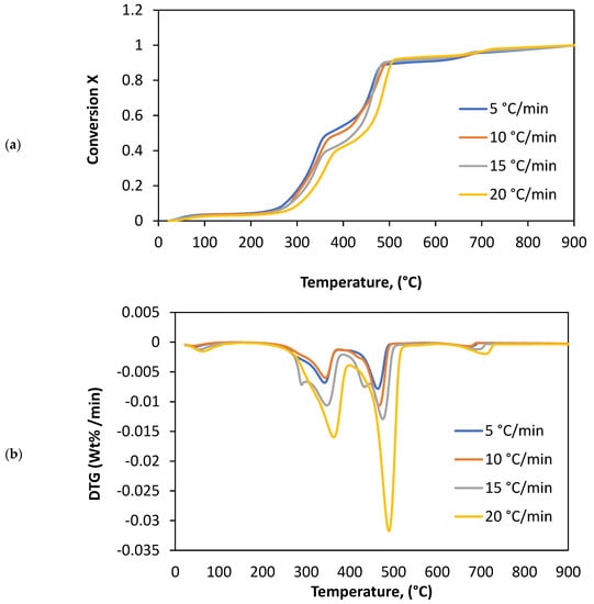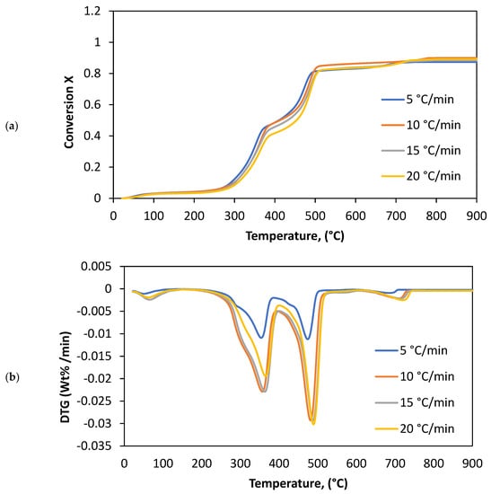 The conversion curve represents fourth stages of sample decomposition. In the first stage, for temperature less than 150 °C, it is during the dehydration process that the volatile material and moisture leave the sample with insignificant changes in the mass. Then, in the second and third stages, a region between 250 °C to 550 °C, which is known as active conversion, the sample losses most of its mass in the devolatilization process. In the final stage, only ash and char are left, which is less than 15% of the sample mass []. The weight slowly reduces in the first and the last stage, which is known as the passive reaction.