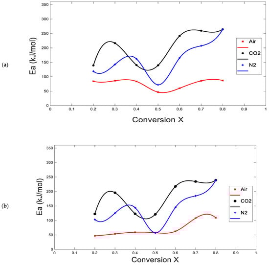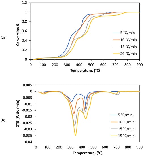 Figure 1, Figure 2 and Figure 3 display the reaction conversion (X) in (a) and show DTG weight loss (wt %/min) profile in (b) for different heating rates in N2, CO2, and air, respectively. The conversion is estimated as a reciprocal of the fractional mass loss. The higher the rate of conversion, the faster the thermal decomposition or rate of reaction. Table 2, Table 3 and Table 4 show thermal decomposition parameters of Subcoal™ PAF in N2, CO2, and air atmosphere. The results show that most of the sample material was converted to products in the temperature range of 250 °C to 550 °C as confirmed by Slopiecka et al., in 2012 []. The raising of heating rate shifts the curve of fractional extent conversion to a high temperature region. The heating rate increases the initial temperature of decomposition (Onset temperature) [].