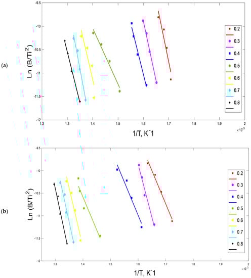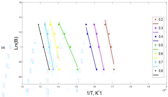 For a progressive value of conversion degree, the term is plotted against to give a straight-line slope of ; hence, the apparent can be determined, while the value of can be calculated from Equation (11).
