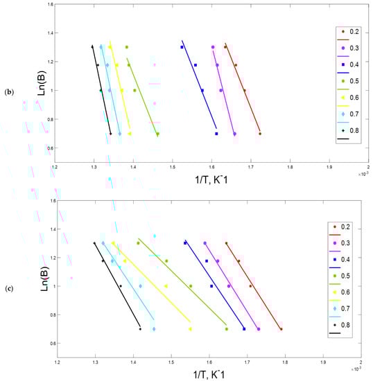 KAS is an alternative model free method that considers in the derivation the peak temperature () at the maximum reaction rate value. Therefore, this method adopts the following equation to estimate the for different values of and .