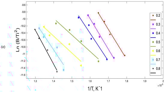 The OFW method is an iso-conversational and integral model free method that includes measurement of the temperature at given values of conversion at various heating rates []. In this method, Equation (9) is integrated utilizing Doyle’s approximation to evaluate the kinetic constants.