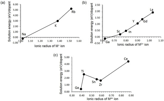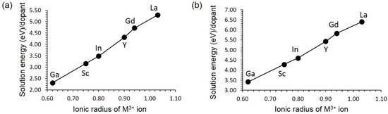 The lowest solution energy is calculated for Ga with an exothermic solution energy of –0.14 eV (refer to Figure 4b). The preference of Ga is partly due to the fact that the ionic radius of Al3+ (0.54 Å) matches reasonably with the ionic radius of Ga3+ (0.62 Å) [46]. Other dopants have endoergic solution energies. Solution energy increases gradually with ionic radius. The La is the most unlikely dopant as it has the highest solution energy of 1.91 eV.