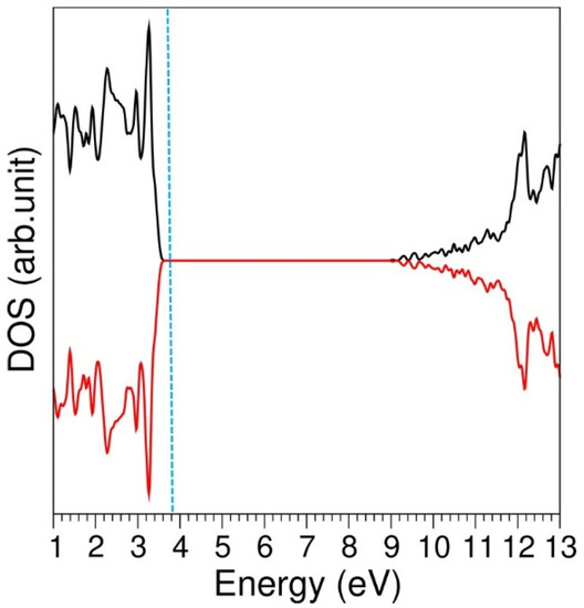 Li incorporation was examined using DFT simulations. Here, we report the geometries, electronic structures, and volume change upon incorporation. The calculated total DOS plot of bulk LiAlSi2O6 is shown in Figure 6. The calculation shows that LiAlSi2O6 is an insulator with a band gap of 5.50 eV, which is in agreement with the band gap value of 5.575 eV calculated using DFT simulation by He et al. [47]. The total magnetic moment of the bulk LiAlSi2O6 is zero, as evidenced by the total DOS plot, in which spin up states are the mirror image of spin down states about the x-axis.