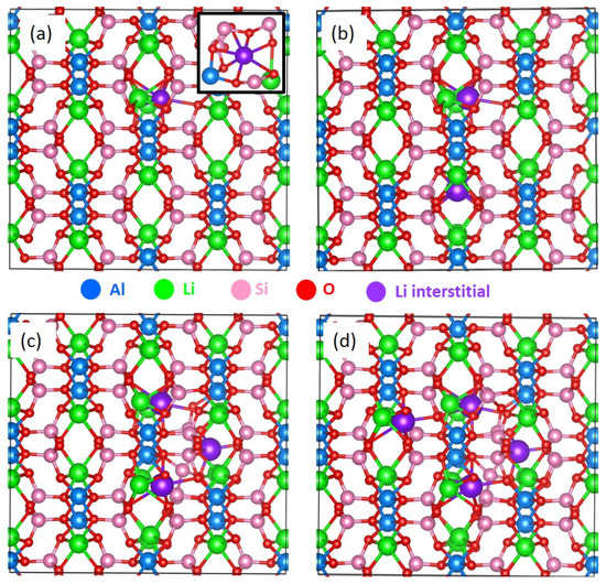 Relaxed structures of (a) a single Li, (b) 2Li, (c) 3Li, and (d) 4Li incorporated into LiAlSi2O6.
