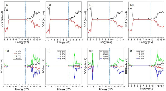 Figure 8 shows the total DOS plots calculated for the Li-incorporated structures. Fermi energy level shifts towards conduction band upon incorporation. This is because of the presence of electrons that were produced during the Li incorporation. The resultant complexes exhibit a metallic character and Fermi levels are occupied by the states associated with Li according to the atomic DOSs plotted for incorporated Li (see Figure 8e–h).