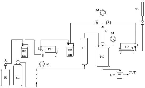 Briefly, the high-pressure pump P1 delivers the CO2 (stored in the tank S1) to the saturator S. The carbon dioxide before being pumped is cooled in a refrigerating bath RB to avoid pump cavitation. Furthermore, before reaching the saturator, it is pre-heated in HB. The saturator is a high-pressure vessel (25 cm3 internal volume) in which 5 mm perforated Berl saddles are placed to favor optimal contact between the liquid phase and the supercritical phase and allow the achievement of thermodynamic equilibrium. The second high-pressure pump (P2) permits the feeding of the liquid solution (stored in the burette S3), consisting of the solutes solubilized in the liquid solvent to the saturator. The mixture constituted by the liquid solution and the scCO2 dissolved in it is sprayed from the saturator S to the atmospheric-pressure precipitation chamber PC (3000 cm3 internal volume) through an 80 μm internal-diameter stainless-steel nozzle. The liquid droplets’ evaporation is assured by a flow of nitrogen at 130 °C stored in a tank (S2) and heated in an electric heat exchanger (HE), which enters from another port from the top of the precipitation chamber. The temperature control in the saturator and the precipitation vessel is ensured by controllers connected with electrically thin bands, whereas the pressure is determined by a test gauge manometer (M). The precipitated powder is collected at the bottom of the precipitation chamber on a stainless-steel filter (size of pores of around 0.1 μm), allowing the passage of the gaseous mixture CO2–solvent. The total quantity of delivered CO2 is measured at the exit by a dry test meter (DM).