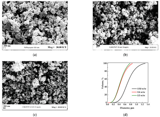 By comparing the volumetric cumulative PSDs (reported in Figure 2d), it is possible to observe that, increasing the PVP/CUR ratio from 3/1 to 6/1, the mean diameter was not affected by the increase in the polymer/active principle ratio; at a ratio equal to 10/1, the average diameter increased.