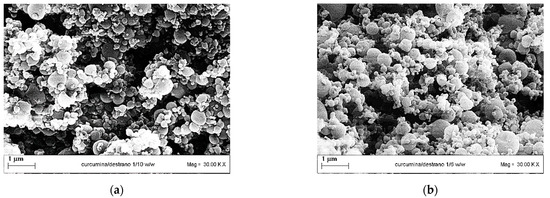 DXT/CUR particles produced by SAA from EtOH/H2O 70/30 at 5 mg/mL. Effect of the API/carrier ratio: (a) 10/1 w/w; (b) 6/1 w/w.