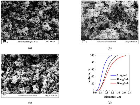 For this set of experiments (#7–9), the HP-β-CD/CUR ratio was fixed at 6/1 w/w. The total concentration in the liquid solution constituted by the solutes dissolved in an EtOH/H2O 70/30 mixture was varied from 5 to 20 mg/mL. In Figure 4, the FESEM images of the three different tests and the cumulative volumetric particle size distribution are reported. Regarding morphology, sub-microparticles were obtained in all the cases. In terms of mean diameter, it is possible to see (Figure 4d) that, increasing the concentration from 5 mg/mL to 20 mg/mL, the average diameter increased. This behavior is commonly observed in SAA-precipitated powders as, increasing the solute concentration, the viscosity of the solution increases, and larger droplets are formed at the injector outlet, resulting in the production of larger dried particles.