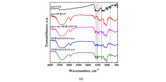 Figure 5c shows the FT-IR spectra related to the system HP-β-CD/CUR. The spectrum of pure HP-β-CD showed two prominent absorption bands at 3414 cm−1 and 2929 cm−1 due to the stretching of the -OH and CH groups, respectively. In addition, it showed a peak at 1638 cm−1 attributable to the bending of the H-O-H group, a peak at 1157 cm−1 linked to the asymmetric stretching of the C-O-C glycosidic bridge, and two peaks corresponding to wavenumbers equal to 1082 and 1032 cm−1 due to the stretching of groups C-C and C-O, respectively [48]. The spectra of the physical mixture and the SAA process were more similar to the cyclodextrin one; however, some characteristic bands of curcumin were visible, highlighted with black vertical lines in the graph. Some typical bands of curcumin, indicated with green vertical lines, were instead observed in the spectrum of the physical mixture but not in the SAA powders, probably due to the capability of the cyclodextrin to form inclusion complexes. Indeed, the disappearance of some characteristic bands of the active compound can be attributed to its incorporation into the cyclodextrin cavity, so curcumin was “hidden” [41].