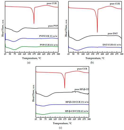 Differential scanning calorimetry analyses were conducted on pure materials and coprecipitated powders and are reported in Figure 6. Curcumin alone is crystalline; its thermogram showed the melting peak at 174 °C [32]. The pure PVP curve had only a broad endothermic peak below 100 °C, linked to water loss. The coprecipitated powders showed an amorphous behavior similar to the PVP one, while the curcumin melting peak was not detected, because the drug was incorporated within the polymer. The unprocessed dextran diffractogram (as reported in Figure 6b) showed a large endothermic peak at a low temperature due to the dehydration process [23]. The coprecipitated powders’ thermogram was similar to the polymer one because the coprecipitated powders were amorphous as the polymer and because the curcumin was hidden in the polymeric matrix.