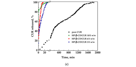 Regarding the cyclodextrin/CUR samples, the HP-β-CD/curcumin 3/1 w/w sample showed a faster dissolution than the pure curcumin did, taking about 30 min for the complete dissolution. In contrast, HP-β-CD/curcumin 6/1 w/w and 10/1 w/w took about 15 min. Additionally in this case, HP-β-CD/curcumin 3/1 w/w is probably the best choice from a pharmaceutical point of view.