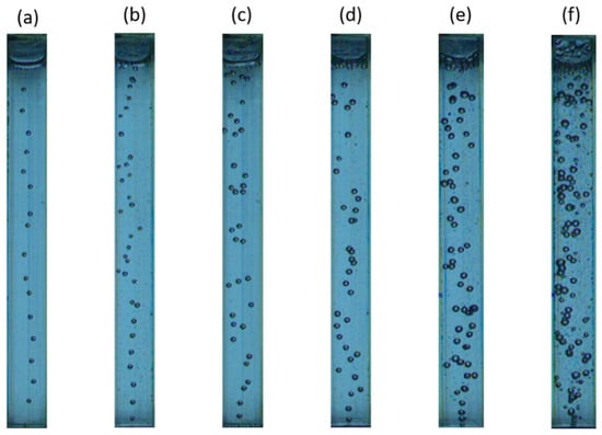 Representative pictures of bubble flow regimes with the increase of gas flowrate under a static liquid flow. dG = 100 µm. (a) QG = 3.7 mL/min; (b) QG = 5.4 mL/min; (c) QG = 9.9 mL/min; (d) QG = 15.5 mL/min; (e) QG = 22.9 mL/min; (f) QG = 32.7 mL/min.