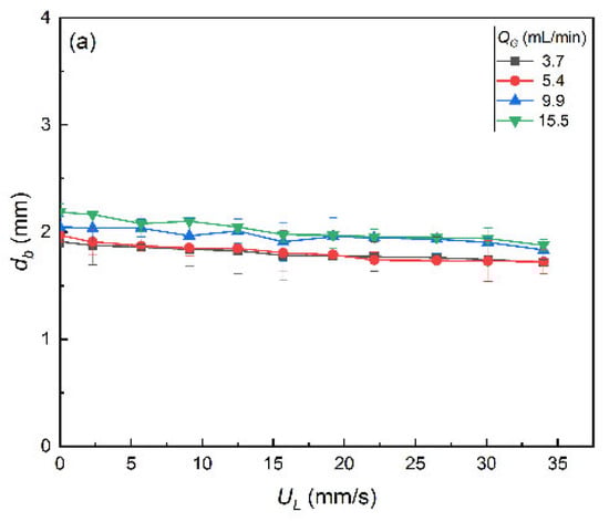 In contrast, db decreased with the increase of liquid velocity, as the co-current liquid flow accelerated bubbles detachment, thus shortening the time for bubble expansion. However, the influence from liquid velocity on bubble size was relatively insignificant, which could be reflected from the small descent slopes of the curves in Figure 5. Therefore, this section not only confirmed that the bubble size is primarily enhanced by the orifice diameter and gas flowrate [] but also revealed that the co-current liquid flow accelerates bubble detachment to inhibit bubble growth.