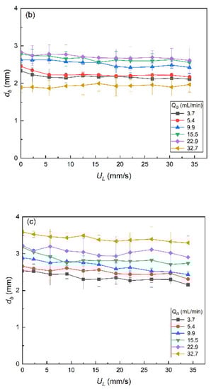 The mean bubbles’ size for different capillary sizes of (a) dG = 50 µm, (b) dG = 100 µm, (c) dG = 50 µm as a function of liquid velocity, UL and gas flowrates, QG.