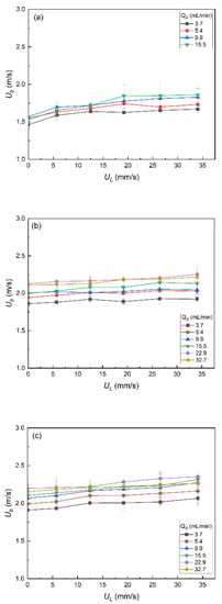 Bubbles’ velocity as a function of liquid velocity, UL for the different gas flowrates, QG. Subfigures correspond to the three different orifice sizes of (a) dG = 50 µm, (b) dG = 100 µm and (c) dG = 150 µm.