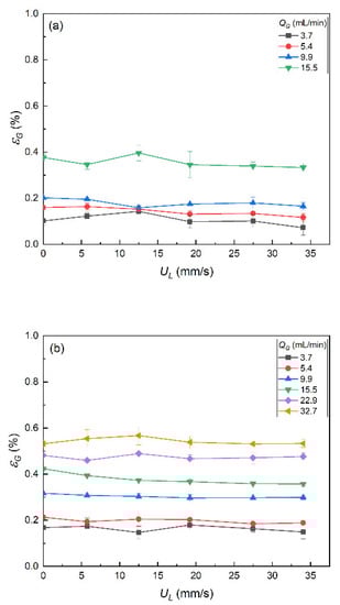 Bubbles’ volume fraction ƐG is the ratio of total bubbles volume to the bed volume, where the total bubbles volume is not only related to the average bubble size but also the number of bubbles. The characterization of ƐG under the effects of different gas flowrate, liquid velocity and gas orifice size are illustrated in Figure 7. It is noticed that ƐG increased significantly with the increase of gas flowrate, as high gas flowrate meant more gas pumped into the chamber per unit time to produce more bubbles. This observation is consistent with Zenit et al. [], who reported a positive correlation between superficial gas velocity and mean gas volume fraction measured by an impedance probe. However, ƐG was observed to significantly increase when the high gas flowrate turned the homogenous flow regime into the heterogeneous regime (e.g., ƐG significantly increased when gas flowrate increased from 9.9 mL/min to 1.5 mL/min in Figure 7a), where coalesced bubbles largely increased the total bubbles volume. The big error bars in heterogeneous bubble flow regimes suggests the existence of numbers of dispersed bubbles. On the other hand, the relatively horizontal curves of ƐG with the increase of liquid velocity indicated that the co-current liquid flow had no impact on ƐG, although its effects on bubble size and velocity have been confirmed. Finally, at a fixed gas and liquid flowrate, ƐG was observed to increase with increasing gas sparger size. A larger gas sparger can allow for the growth of bubble size, thus contributing to the higher ƐG. For instance, in the homogeneous flow regimes with 9.9 mL/min of gas flowrate and no liquid flow, ƐG reached 0.20%, 0.31% and 0.33% when gas sparger size was 50, 100 and 150 µm, respectively. Besides, the higher ƐG from the larger gas spargers were also witnessed in heterogeneous flow regime, as ƐG in conditions of 100 and 150 µm gas sparger was 0.53%–0.57% and 0.71%–0.73% respectively, with the gas flowrate of 32.7 mL/min (Figure 7b,c). Therefore, this section has concluded that ƐG was increased with increasing the gas flowrate and the gas sparger size, but independent of liquid flows.