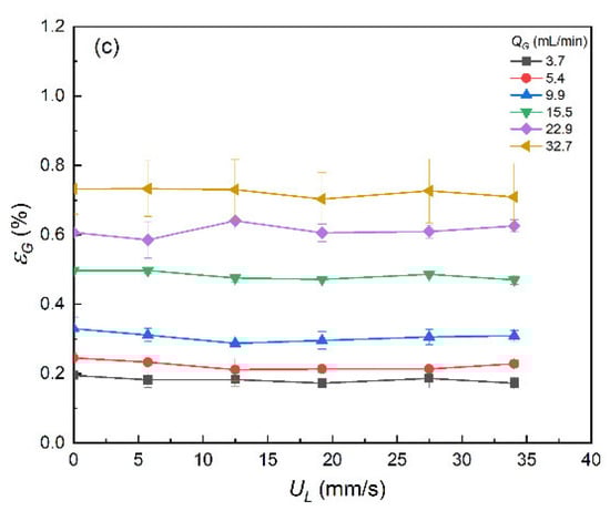Characterization of gas volume fraction, ƐG as a function of gas flowrate, QG and liquid velocity, UL with different gas sparger sizes: (a) dG = 50 µm, (b) dG = 100 µm, (c) dG = 150 µm.