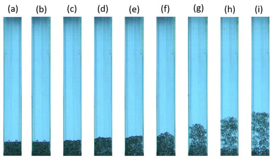 - Parvoids fluidization. With a further increase of liquid velocity, particles fluidized and circulated in the bed resulted in the partial voids bed [] (Figure 8g–i).
