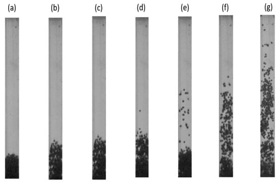 Fluidization regime changes with the increasing superficial liquid velocity in pellet fluidization: (a) UL = 0 mm/s, (b) UL = 1.2 mm/s, (c) UL = 2.6 mm/s, (d) UL = 3.9 mm/s, (e) UL = 4.5 mm/s, (f) UL = 5.7 mm/s, (g) UL = 7.0 mm/s [].
