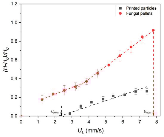 In the liquid–solid fluidization study, solid bed expansion was expressed by the ratio of the increased bed height to static bed height, (H − H0)/H0. Figure 10 plots the solid bed expansion versus superficial liquid velocity based on the defluidization process, which avoided pressure overshoot and hysteresis effects []. The relationship between the bed expansion ratio of 3D-printed particles and UL is linear, from which the Umf for particles could be obtained from the intersect by extrapolating the fitting line to the abscissa []. The linear expansion behavior of pellets again UL was also reflected by the fitting lines, but there was an apparent slope change at a different liquid flow. Such a slope transition was initially reported by Smith et al. [], who observed the gradual transition from packed bed to fluidized bed during the fluidization studies of flocs and pellets. Based on our previous report, the smaller slope was due to the extended bed regime where pellets were agglomerated together and bed height increased slowly at low UL, while the larger slope has resulted from the fluidization regime changed from the extended bed into the partially fluidized bed that pellets started to fluidize. Therefore, Umf for pellets fluidization should be defined as the liquid velocity which led to the expansion and detachment of the pellets from the base, with good overall fluidization [].