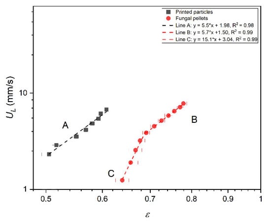 The extrapolated terminal velocity Ut was obtained by extrapolating the fitting lines to a voidage of unity. Based on the fitting line A and line B, Ut reached up to 95.5 mm/s and 31.6 mm/s for particles and pellets, respectively, which were much higher than the theoretical Stokes law terminal velocity of 436 µm/s and 196 µm/s for particles and pellets, respectively. This again indicates the influence of wall effects and surface force of particles on solid fluidization. Compared to the fungal pellets, the higher theoretical and extrapolated Ut for particles fluidization was due to the higher density of printed particles, which could be explained from Stokes Law []. In addition, different from the dense and solid particles, pellet is actually a core of packed hyphae surrounded by the hairy region that contains the radially growing portion of the hyphae [].