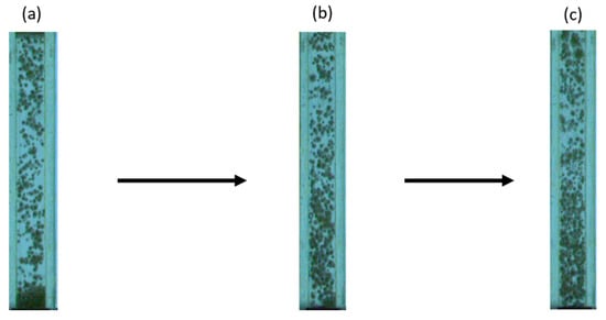 Representative snapshots of different flow regimes for fungal pellets fluidization with increasing gas flowrate: (a) QG = 9.9 mL/min, (b) QG = 22.9 mL/min, (c) QG = 43.8 mL/min [].