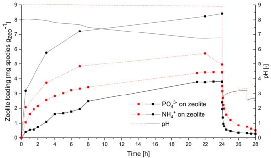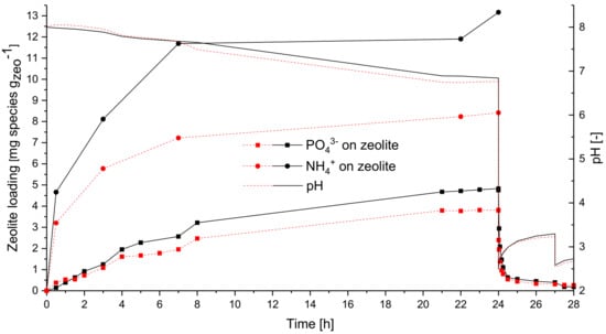 The zeolite loading of ammonium and phosphate was calculated using the difference between initial and temporally decreasing concentration in solution related to the total mass of zeolite (see Equation (1)).