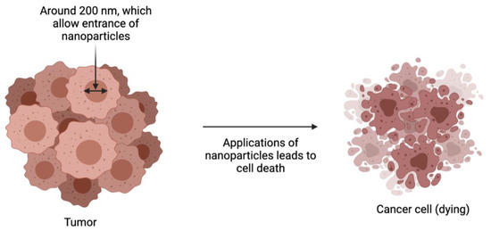 Owing to the EPR effect (enhanced permeability and retention effect), nanoparticles up to 200 nm can enter and accumulate in the tumor cells, and cause tumor cell death (created with BioRender.com).