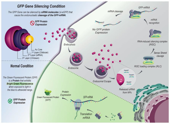 AuNPs have also been used in combination with biopolymers, capable of being incorporated into the human body and metabolized to deliver nucleic acids. A recent study shows the process of assembling a hybrid material based on AuNPs by reducing HAuCl4 in the presence of chitosan, which acts as a capping agent, thus obtaining chitosan-coated AuNPs of 20 nm on average. Those nanoparticles were used to deliver siRNA. The results show that, in addition to the high stability of the obtained particles in biological systems, there is increased efficiency in releasing the therapeutic agent and high absorption by cells owing to endocytosis. Cytotoxicity relative to lung epithelial cells H1299-eGFP, as well as suppression of biomarker signals, indicated a high efficiency of siRNA delivery using the developed system (Figure 3) [99].