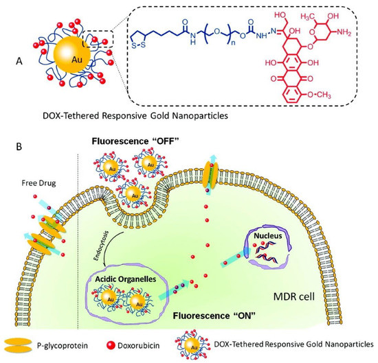 (A) Schematic illustration of doxorubicin (DOX)-tethered responsive gold nanoparticles and (B) their cooperation between enhanced doxorubicin cellular entry and a responsive intracellular release of doxorubicin into the cells to overcome drug resistance [104].