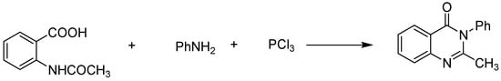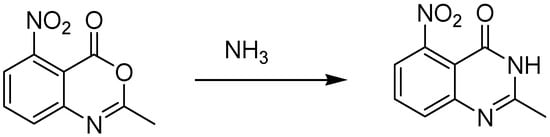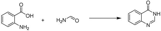 - Meyer, J.F.; Wagner, E.C. The Niementowski reaction. The use of methyl anthranilate or isatoic anhydride with substituted amides or amidines in the formation of 3-substituted-4-keto-3,4-dihydroquinazolines. The course of the reaction. J. Org. Chem. 1943, 8, 239–252. [Google Scholar] [CrossRef]