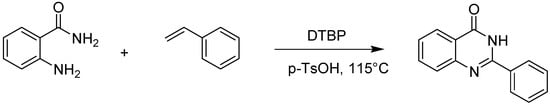 - Sharif, M. Quinazolin-4(3H)-ones: A tangible synthesis protocol via an oxidative olefin bond cleavage using metal-catalyst free conditions. Appl. Sci. 2020, 10, 2815. [Google Scholar] [CrossRef]