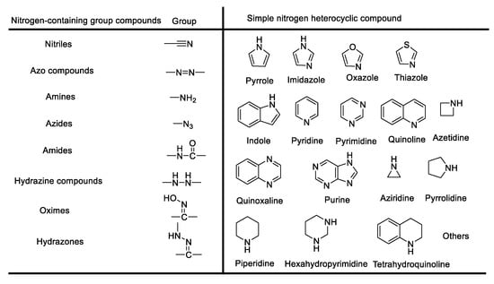 Nitrogen-containing compounds are frequently used in the textile, agricultural, pharmaceutical, and chemical industries to produce amines, dyes, and pesticides. Among them, the most commonly used nitrogen-containing compounds in organic synthesis are aromatic amines and their derivatives, which are usually used as feedstocks or solvents. In addition, ammonia and azo compounds are also used as raw materials in the production of dyes and pesticides [14].