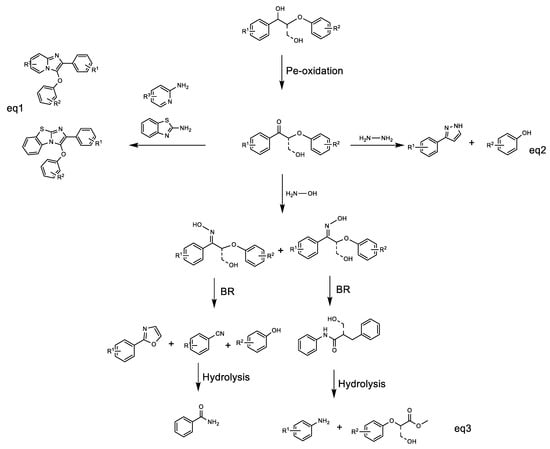 Hydroxylamine and hydrazine are generally used as nitrogen reagents and reducing agents in classical organic synthesis. In particular, the oximes, which are formed via the condensation of carbonyl groups with hydroxylamine, are versatile intermediates for the generation of amides. Recently, Zhang and Wang’s group introduced NH2OH-mediated lignin conversion to isoxazole and nitrile [50,51] (Scheme 2 Equation (3)). Both products were obtained in one step via the same oxime intermediate, followed by condensation of β-hydroxyl ketone with hydroxylamine and then Beckmann rearrangement to construct isoxazole and nitrile, respectively. Moreover, based on the carbonyl condensation property and hydrazine as the amination and reducing agent, Heinrich et al. developed an attractive strategy through Wolff–Kishner reduction for C-O bond cleavage in lignin ketone models and further cyclization to pyrazole. Meanwhile, the above system also obtained corresponding monophenols due to the cleavage of C-O bonds (Scheme 2 Equation (2)) [52]. Zhong et al. reported a copper-catalyzed system or an efficient iodine/tert-butyl hydroperoxide (I2/TBHP) catalytic system for catalytic oxidative cyclization of lignin models with 2-amino azaarenes to synthesize imidazo heterocycles (Scheme 2 Equation (1)) [53,54].