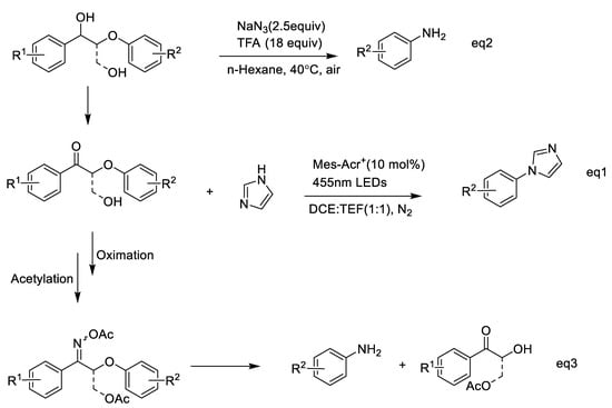 The preparation of aromatic amides and benzonitriles with pre-oxidized lignin is described above; thus, the amides and benzonitriles produced could be further hydrolyzed to aniline (Scheme 2, Equation (3)) and carboxylic acids, [70] respectively. Recently, Nicewicz et al. realized the selective cleavage of aryl ether in lignin via photocatalyzed nucleophilic aromatic substitution using amines under mild conditions. A lignin β-O-4 ketone model was used, and selective O-4 bond cleavage occurred and generated aniline, while other groups on the arenes were maintained (Scheme 3, Equation (2)) [71]. Besides this, Jiao et al. recently developed amination using NaN3 and realized a transition from alkylarenes to anilines via redox-neutral site-directed carbon–carbon amination (Scheme 3, Equation (1)) [72]. This transformation of aromatics involved the use of O2 as an environmentally benign oxidant. Subsequently, the secondary alcohol intermediates could also be transformed into the corresponding anilines without any oxidant. Therefore, lignin model compounds containing a propanediol segment were redox-neutrally depolymerized into corresponding primary arylamines. Based on the cleavage of the β-O-4 ketone model, tandem selective oxidation, oximation, and acylation reactions were used, followed by imine-participated ether cleavage via 1,4-aryl migration and a subsequent hydrolysis reaction, to yield anilines and a-hydroxy ketones as products [73] (Scheme 3, Equation (3)).