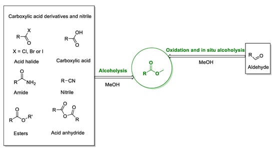 The dehydrated products of acids and alcohols are esters, which have fragrance and are widely used as food additives [74] As a kind of carboxylic acid derivative, esters are an important class of chemicals and are widely used in the preparation of fine chemicals, natural products, medicines, and agrochemicals [75]. In addition to the esters traditionally obtained by the dehydration reaction of carboxylic acid and alcohol, esters can also be prepared from other carboxylic acid derivatives such as amides, acid anhydrides, and acid chlorides (Scheme 4). The esterification procedure is reversible and suffers from inherent drawbacks, such as the fact that it is hard to increase the conversion rate and isolate or separate the catalysts and/or products in time [76] Aldehydic compounds in an alcohol-containing solution are also able to provide oxide esterification effectively, so they are used as a supplement to traditional protocols [77,78,79,80,81,82,83,84]. In recent years, benzylic alcohol and methanol as substrates for esterification have attracted more attention; they have been used for direct, economical, and environmentally friendly conversion into esters in the presence of catalysts and oxidants, [85,86,87,88,89,90] in which the alkali additive is usually able to increase the yield of esters [90].