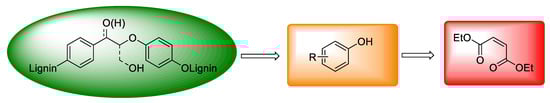At present, there are not many types of non-aromatic acids prepared by oxidative depolymerization of lignin. Diethyl maleate is another class of functionalized ester based on carboxylic acid derivatives from lignin conversion (Scheme 5). Strategies for the selective production of diethyl maleate via oxidative cleavage of lignin aromatic units have been developed, including the use of heterogeneous catalysts [13] or ionic liquids [102]. Li et al. used polyoxometalate ionic liquids to promote cleavage of a lignin aromatic unit to obtain bulk chemical diethyl maleate, [13] and according to their report, lignin aromatic units were converted to diethyl maleate in the intensive synergistic effect between the acidic depolymerization, oxidative aromatic ring cleavage, and in situ esterification [13]. Besides this, Liu’s group also designed novel hierarchical Ce-Cu/MFI nanosheets and used them for the selective oxidative cleavage of organosolv lignin. As a result, the reaction pathway underwent a two-step process in which the lignin was converted to monophenols by selective cleavage of the C-C bonds, and these monophenols were then transformed to final products of diethyl maleate and other C3-C5 esters via benzene ring-cleavage [102].