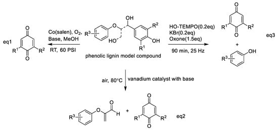 In addition to phenols, highly active aromatic compounds such as anthracene, phenanthrene, and anilines can be transformed to the corresponding quinones by chemical oxidation, even directly by molecular oxygen oxidation. Lignin is a kind of abundant polyphenolic polymer that imparts the potential to generate quinones. Recently, Parks et al. used Co (salen) catalysis to form benzoquinones and benzaldehydes through oxidation of lignin models belonging to the monomeric lignin models syringyl (S), vanillyl (G), and 4-hydroxybenzyl alcohol (H) [105]. In particular, this group attempted to combine computational and experimental approaches to investigate the mechanism of Co (salen)-catalyzed oxidation of the monomeric lignin models. Density functional theory calculations and experiments revealed that S oxidation occurs more easily to form dimethoxybenzoquinone than G and H oxidation with a pyridine-coordinated Co (salen) catalyst, but adding bulky, noncoordinating bases enhanced the oxidation of G to form methoxybenzoquinone (Scheme 6, Equation (1)) [105]. Similarly, Fu’s group also reported that a vanadium catalyst with base additive could be used in the C−C cleavage of β-O-4 lignin phenolic model compounds to generate benzoquinone products and acrolein derivatives (Scheme 6, Equation (2)) [106]. Moreover, Bolm and co-workers used a ball milling method to treat phenolic model compounds with HO−TEMPO/KBr/Oxone (TEMPO is 2,2,6,6- tetramethyl-1-piperidinyloxy), resulting in the production of the corresponding quinones and phenol derivatives (Scheme 6, Equation (3)) [107].