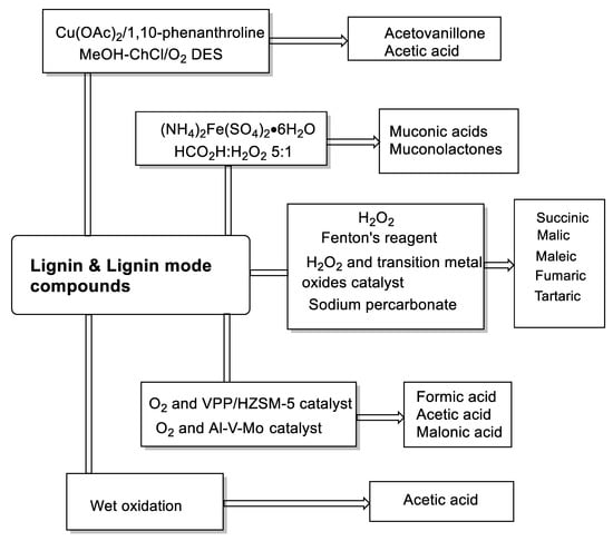 Non-aromatic acids can be generated via oxidation of lignin monomers connected to various hydroxyl [115] or carbonyl-containing compounds [141]. Depending on the oxidants and catalyst, the formation and species of these compounds vary (shown in Scheme 8). In Rodrigues’s work, using H2O2 as an oxidant, lignin model compounds (p-hydroxybenzoic acid, vanillic acid, and syringic acid) and hardwood and softwood lignin samples were oxidized to obtain dicarboxylic acids [115]. In addition, C4 dicarboxylic acids (DCA) were also obtained from lignin oxidation with transition metal oxide (Fe, Co, Cu) modified catalysts [142,143,144]. For instance, recent reports developed methods for the generation of carboxylic acids from the oxidation of lignin by a Fenton oxidation process, with a Fenton reagent consisting of an iron catalyst [145]. However, because lignin depolymerization to dicarboxylic acids by the Fenton oxidation process suffers from poor yield and raw material utilization, Doherty et al. introduced a process based on the use of sodium percarbonate in bagasse lignin depolymerization [111]. Using Doherty’s strategy, higher DCA yields (predominantly oxalic, malonic, and succinic acids) were obtained, without residual solids. Besides this, some other low carbonic acids (lactic acid, formic acid acetic acid, acrylic acid, and malonic acid) were also obtained from oxidation isolation of lignin using vanadium-modified catalysts and oxidants [146,147]. At last, researchers have gradually deepened their understanding of the structure of lignin and promoted the greater potential of lignin. For example, using oxidative cleavage of catechols for the synthesis of muconic acid and muconolactones opens a new route to lignin upgrading [114]. Besides this, Yuan et al. developed a novel catalytic oxidation system consisting of a copper catalyst in MeOH–ChCl/O2 DES capable of acetic acid and acetovanillone synthesis via the selective oxidative cleavage of C–C bonds in lignin side chains [148]. Furthermore, the wet oxidation of lignin and phenolic lignin model compounds easily forms carboxylic acids, including formic acid, acetic acid, and unsaturated dicarboxylic acids with four carbon atoms [149].