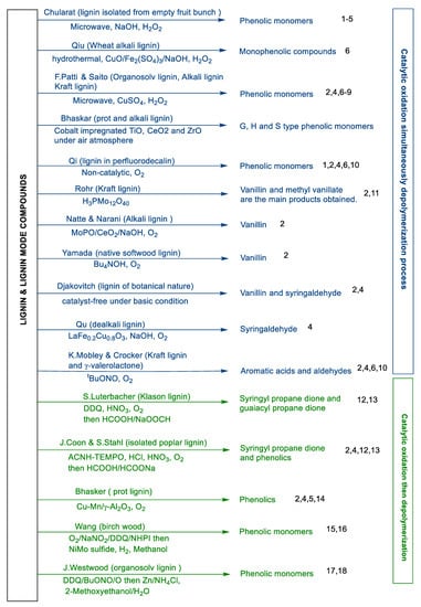 Catalytic oxidation followed by depolymerization of lignin also mainly produces phenolics containing a carbonyl functional group [177]. Luterbacher et al. used 2,3-dichloro-5,6-dicyano-1,4-benzoquinone (DDQ) as an oxidant/catalyst to oxidize the a-OH of lignin into a ketone; then, the oxidized lignin was depolymerized using a formic acid/sodium formate system to a single product reaching 80% yield (syringyl propane dione) and 10–13% guaiacyl propane dione [178]. Similar to Luterbacher’s work, Stahl and Bhaskar et.al. used a catalytic aerobic oxidation process, followed by formic-acid-induced [179] or water/ethanol-water co-solvent [180] hydrolytic depolymerization resulting in monomeric phenolics containing carbonyl groups. Besides this, Wang et al. used catalytic oxidation with the O2/NaNO2/DDQ/NHPI system followed by a hydrogenation depolymerization process with NiMo sulfide catalyst to produce phenol monomers in 32% yield from birch powder [181]. Westwood et al. also put an organosolv lignin through a two-step depolymerization process similar to the above to generate phenolic monomers [182].