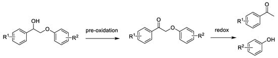 In recent years, the two-step conversion strategy of lignin via pre-oxidation followed by redox catalytic depolymerization has been popular in the valorization of lignin, with the ability to obtain corresponding phenols and ketones as shown in Scheme 10. According to recent reports, the redox step involves photoredox [117,119,141,143,183] and biomimetic redox [70,135].